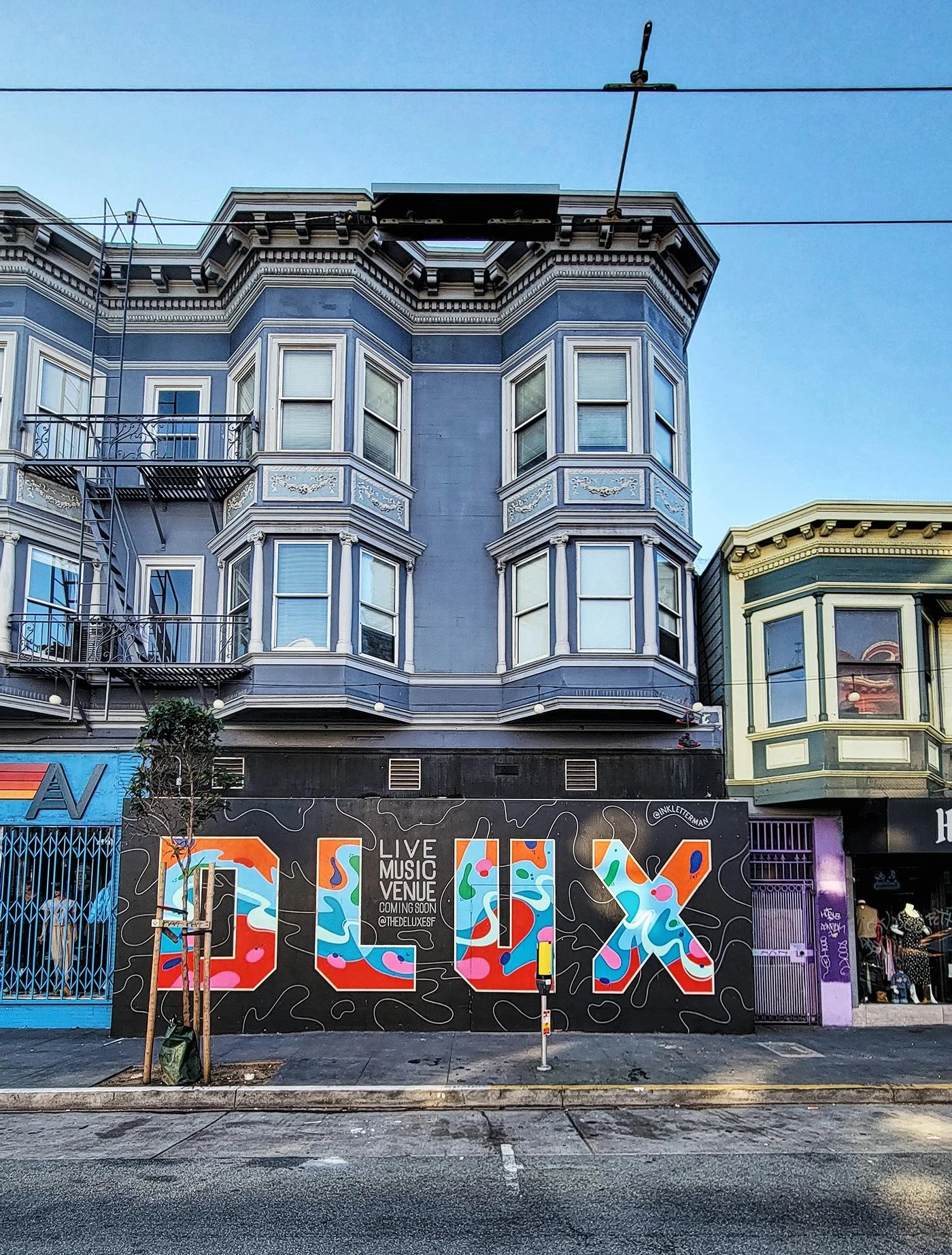 The new crew at Club Deluxe broke ground last month on their legacy restoration project and, in doing so, erected a massive construction wall. What an amazing canvas! This inspired me to send a message over to Christian and pitch what I saw as an opportunity to temporarily make a positive impact on the neighborhood, as well as, to stir up some hype for the most important return of live music to the upper Haight.