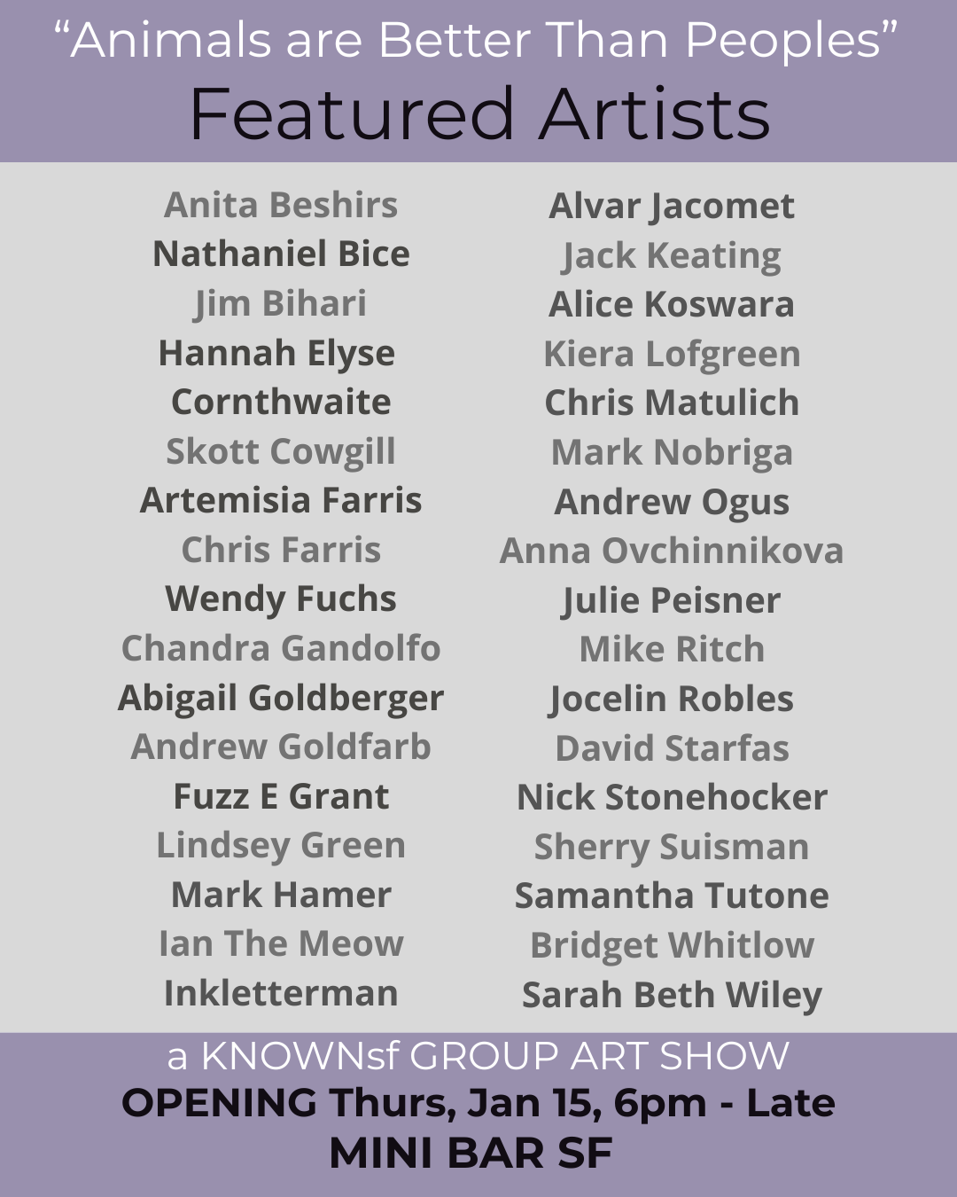 Animals Are Better Than Peoples Thursday, January 15, 2026 6:00 PM 11:59 PM Mini Bar SF 837 Divisadero Street San Francisco, CA, 94117 United States (map) Google Calendar ICS Join us, this Thursday, January 15 for the opening of the 2nd Annual "Animals Are Better Than Peoples" curated by KNOWNsf GROUP ART SHOW and hosted by Mini Bar SF.Show runs through March 8th, 2026 with a closing happy hour from 4-7pm.