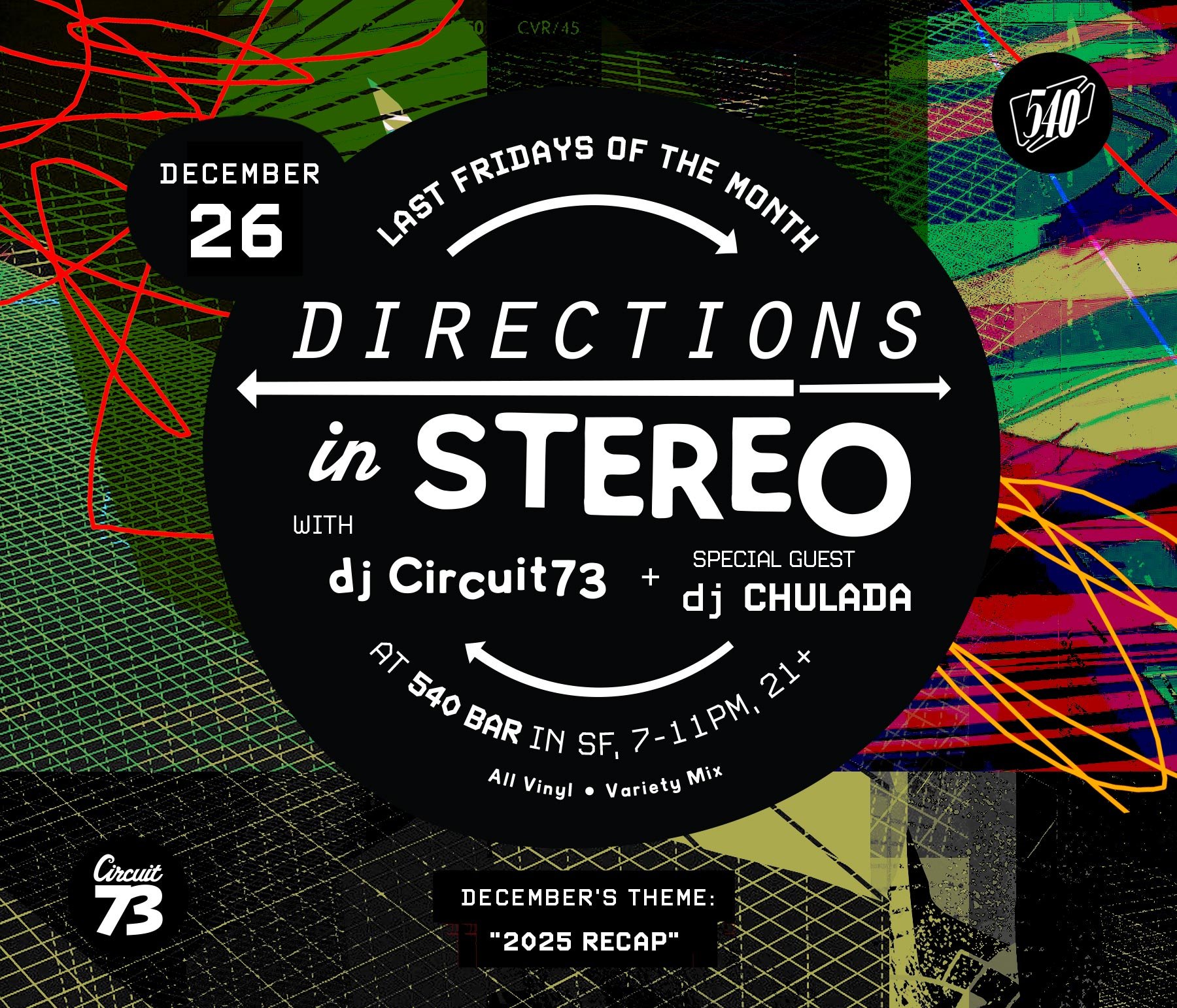 Join me resident dj Circuit73 on the last Friday of the month at 540 Bar as Directions In Stereo cues up, an eclectic, sonic backdrop for the evening. This month DIS welcomes special guest dj Chulada on the 1s and 2s. It's gonna be an all vinyl, variety mix to the max!